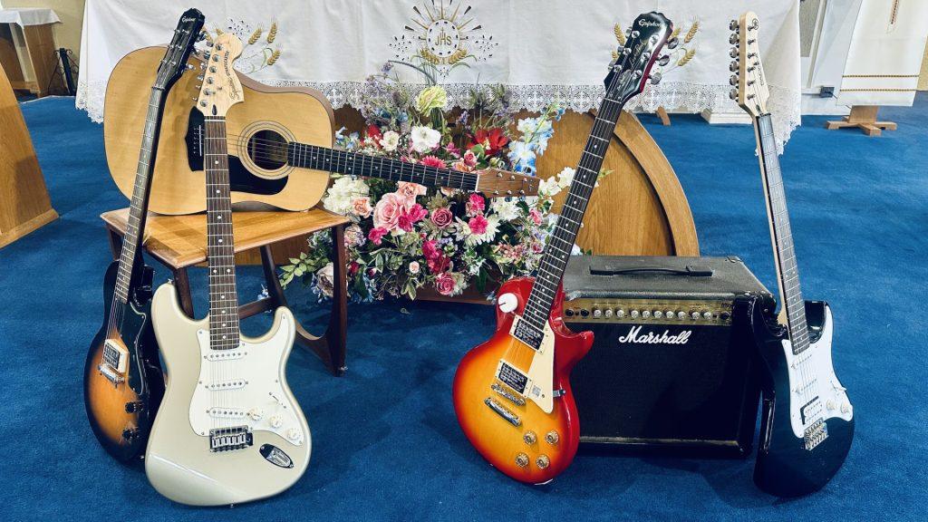 Fr Pat Sherlock has a nephew, Martin, who is a gifted poet, songwriter and guitarist. In his younger days, Martin collected a number of electric and acoustic guitars for himself and his friends to play. Unfortunately, a long-term health issue means that he can no longer use these instruments, and they have been languishing in a cupboard for some time. When Fr Pat mentioned that Our Lady and St Dominic’s was developing its youth ministry, Martin very kindly offered to donate five of the guitars and an amplifier to the parish. We hope they will inspire our young people to develop their musical skills and bring joy to themselves and to others.