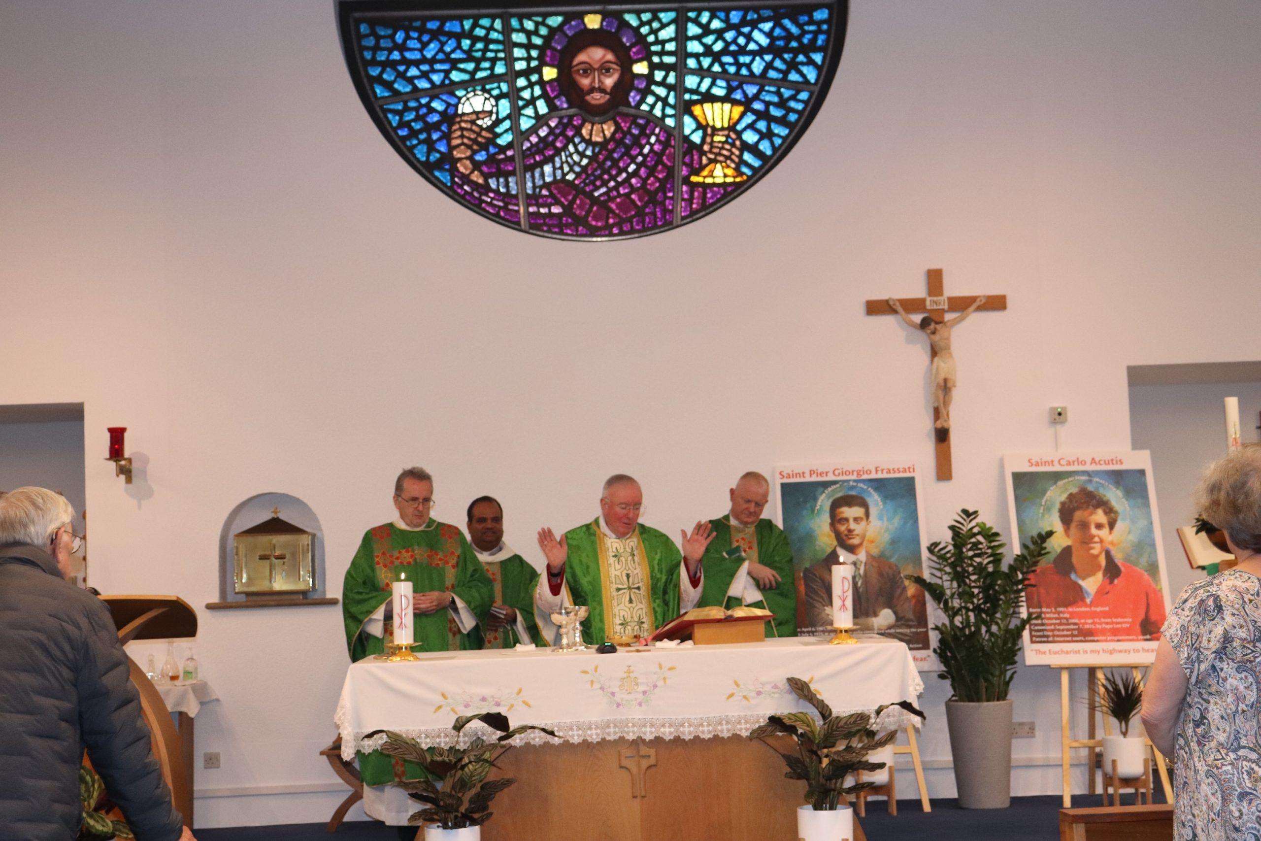 The 10:30am Mass was concelebrated by Bishop Philip, Fr Gerry Briody the Salesian Provincial (GBR) and Fr Anthony. Also present were a Deacon Paul Evans and Deacon Craig Aburn. The church was full with several  hundred parishioners and we had the pleasure of attending a very uplifting and joyful Mass. Â