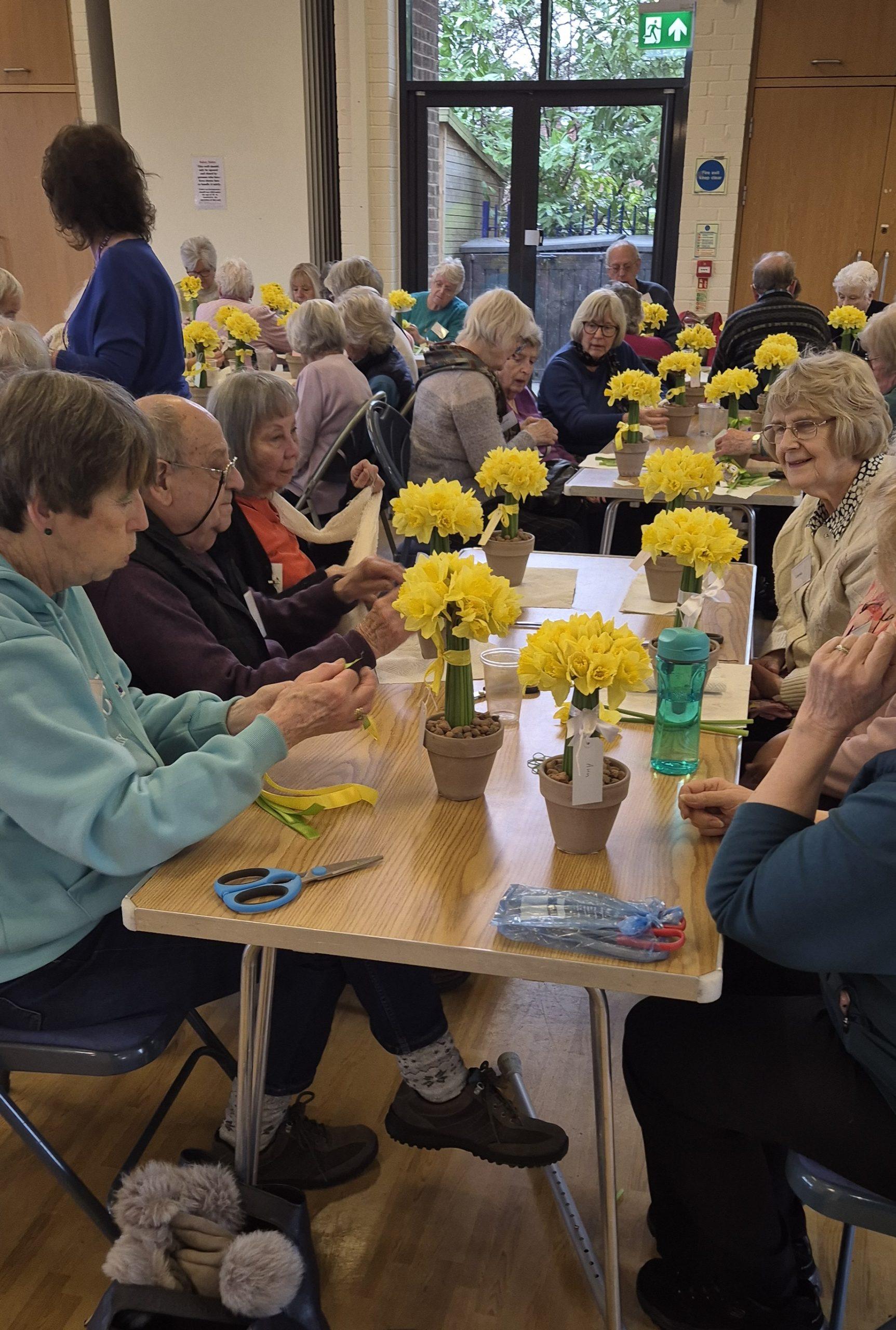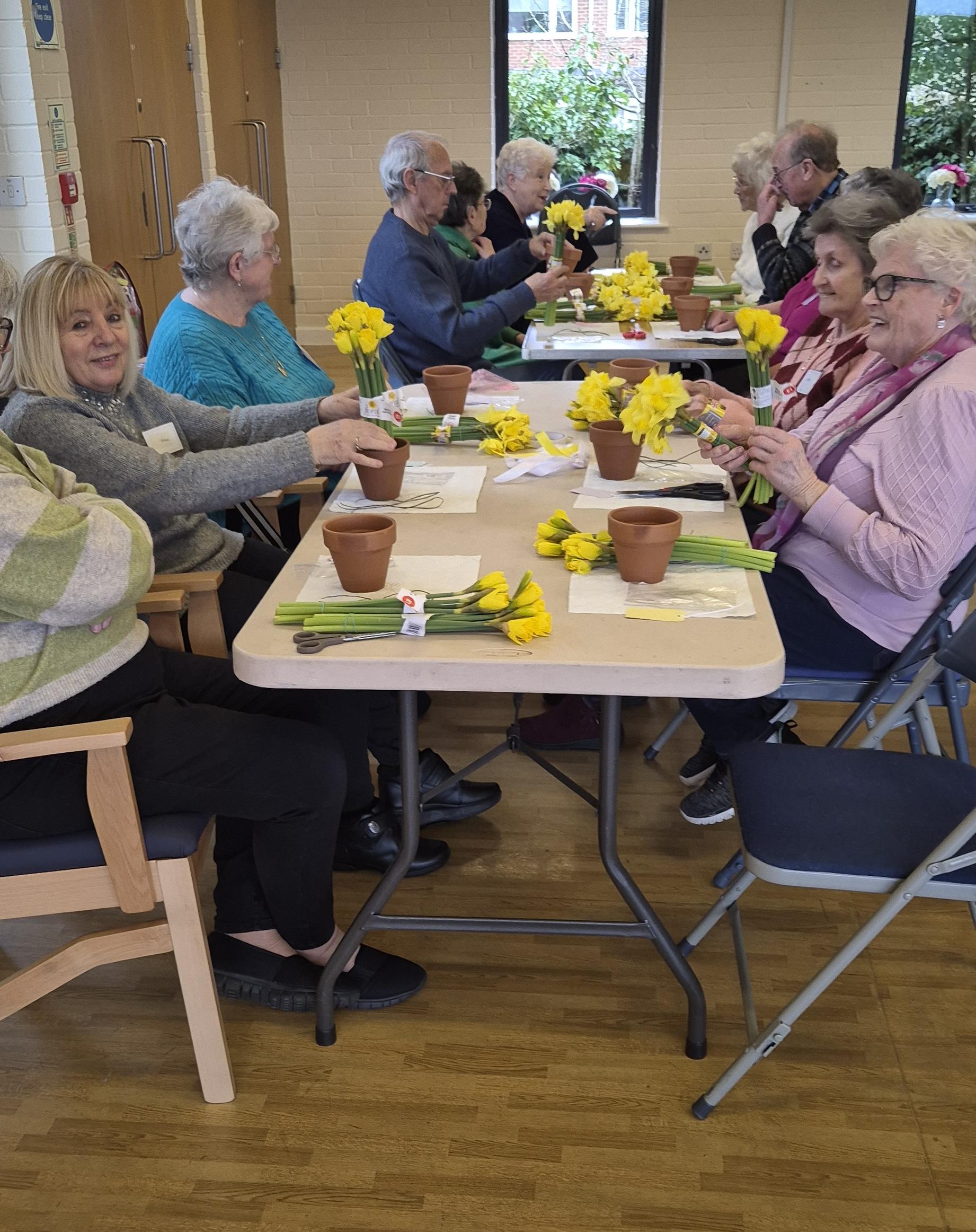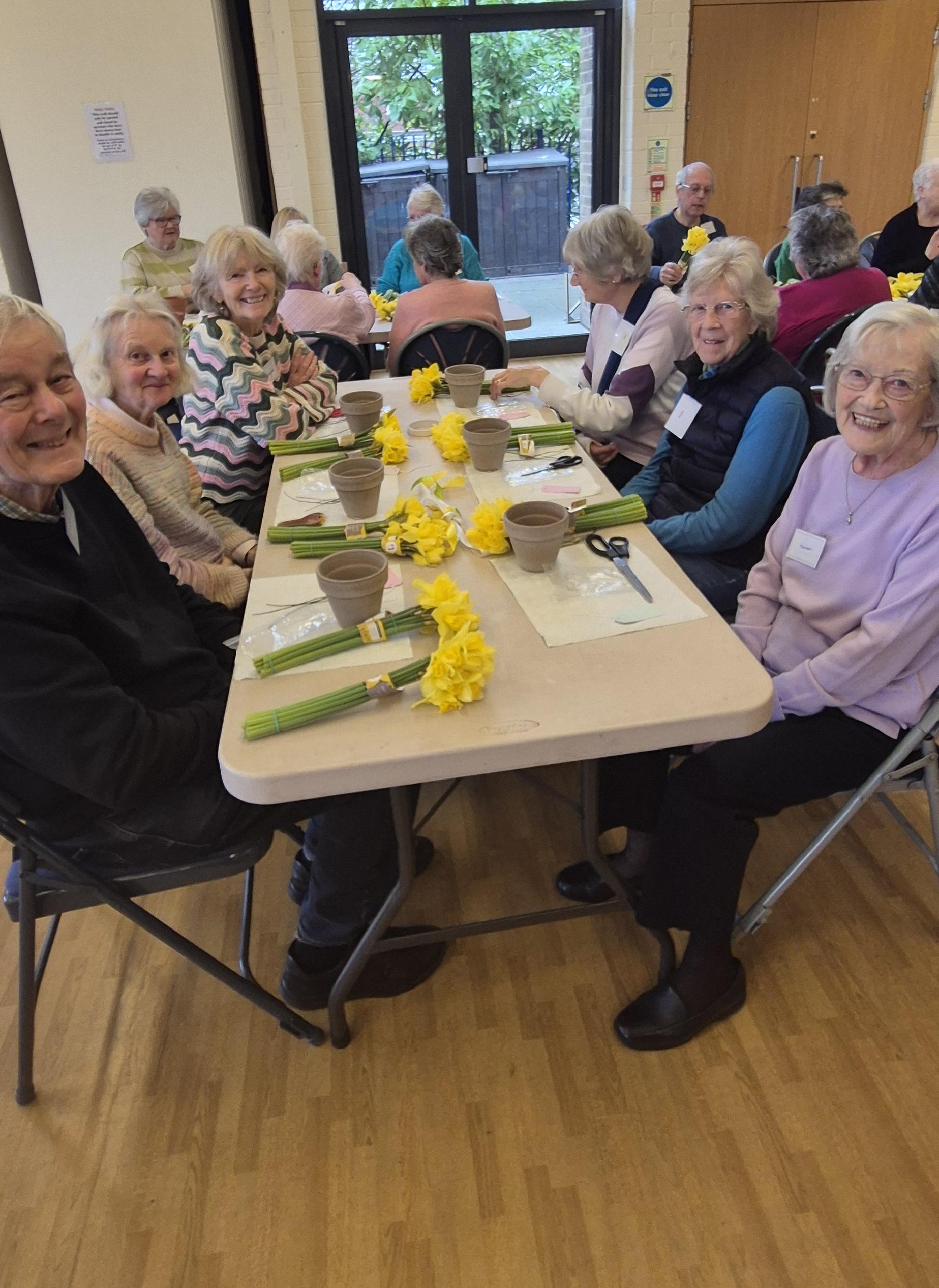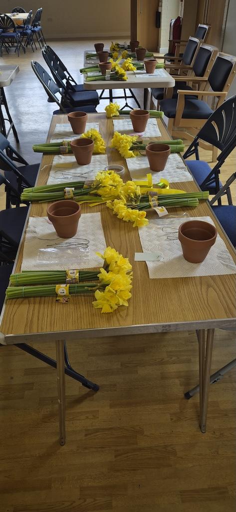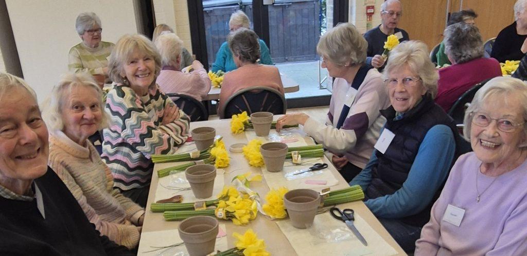 Thank you to Jane Fensome who brought flowerpots, daffodils, ribbons, wire, sticky tape and lots of other bits and bobs. Patiently and slowly, step by step, she showed us how to make a beautiful flower arrangement.  Everyone in the group was greatly impressed with their work of art to take home to display.